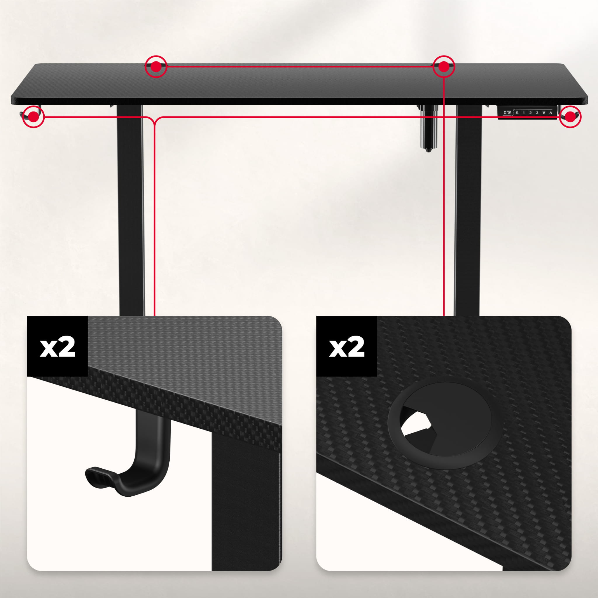• Tu alegi înălțimea biroului potrivită pentru tine. Cu reglarea electrică a înălțimii blatului, o puteți schimba liber și în orice moment.